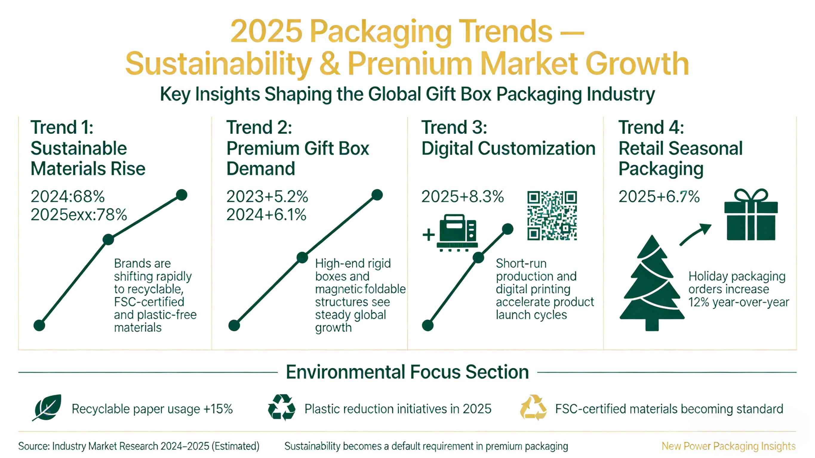 Prognozy badań rynkowych: Rynek pudełek upominkowych premium utrzyma wzrost na poziomie 6–9% w 2025 r. Segment opakowań zrównoważonych wzrośnie o ponad 12% Najszybciej rozwinie się druk cyfrowy i krótkie serie zamówień niestandardowych Patrząc w przyszłość, branża opakowań w 2025 r. będzie odzwierciedlać wyraźniejszy kierunek: zrównoważony rozwój jako podstawa, atrakcyjność wizualna jako najważniejsza cecha i szybkość jako przewaga konkurencyjna.